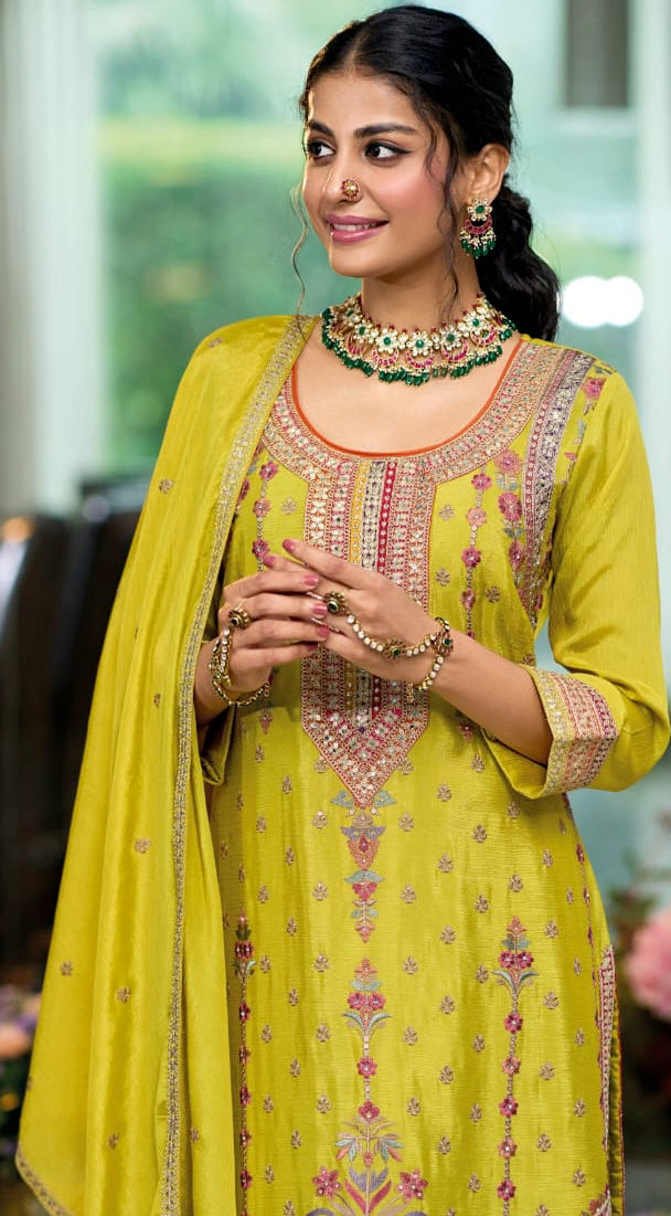 Mustard Yellow Embroidered Georgette Suit with Palazzo & Dupatta