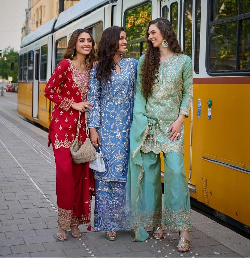 Designer Satin Shimmer Suit Set with Embroidery & Digital Print
